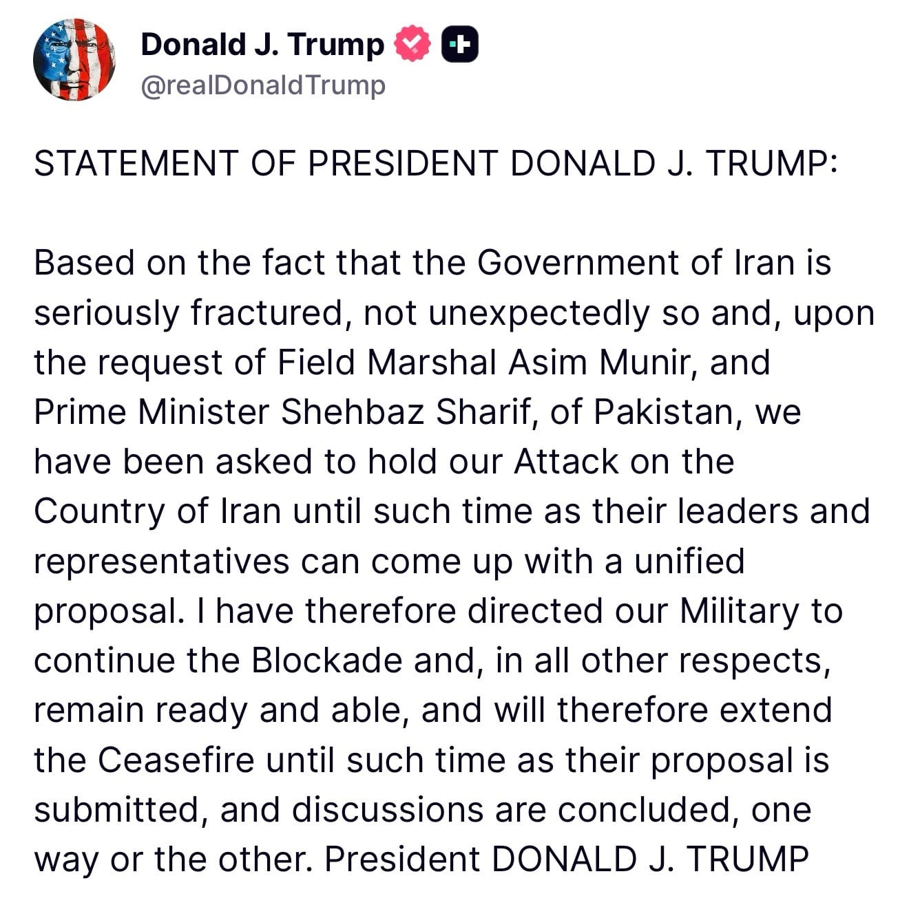 President Donald Trump announced late Monday that he is extending the ceasefire with Iran indefinitely, directing military forces to maintain the naval blockade while remaining ready for potential attack. The decision came at the request of Pakistani Field Marshal Asim Munir and Prime Minister Shehbaz Sharif, who asked for additional time to allow Iran’s fractured leadership to develop a unified proposal.