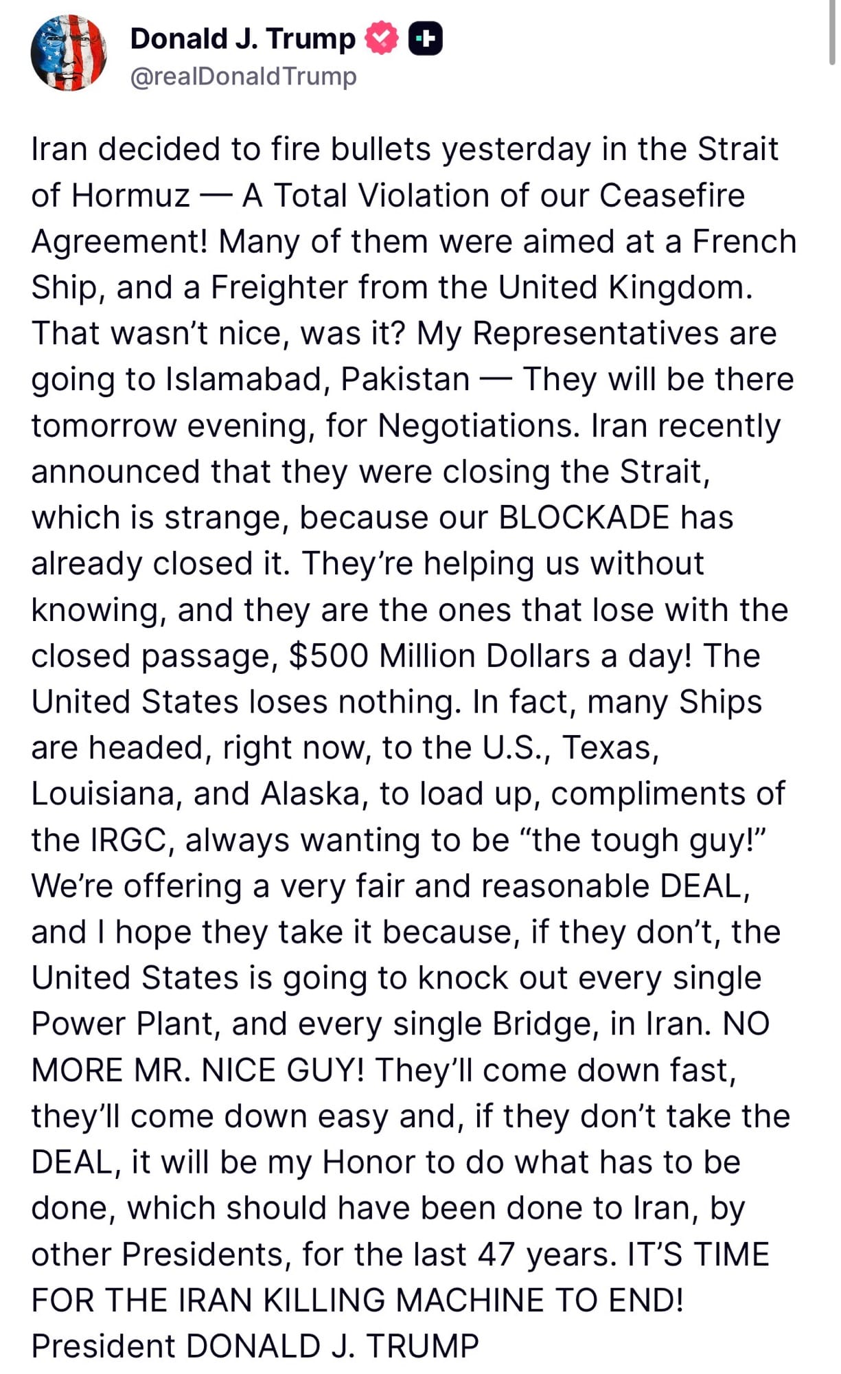 Trump threatens destruction of every Iranian power plant and bridge after Hormuz gunfire against French and British ships, dispatching negotiators to Islamabad. President frames potential attack as 47-year overdue rectification and declares "NO MORE MR. NICE GUY" as deadline approaches.