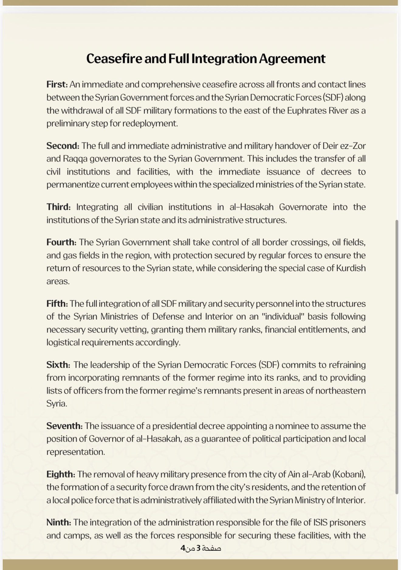 Second: The full and immediate administrative and military handover of Deir ez-Zor and Raqqa governorates to the Syrian Government. This includes the transfer of all civil institutions and facilities, with the immediate issuance of decrees to permanentize current employees within the specialized ministries of the Syrian state.
